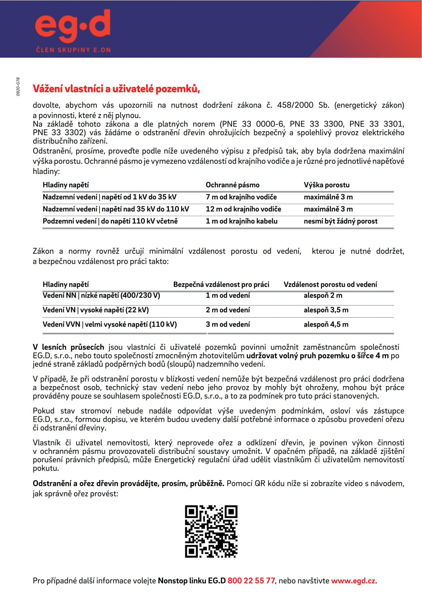 EG.D žádá vlastníky a uživatele pozemků o prořezání zeleně a udržování ochranného pásma kolem vedení