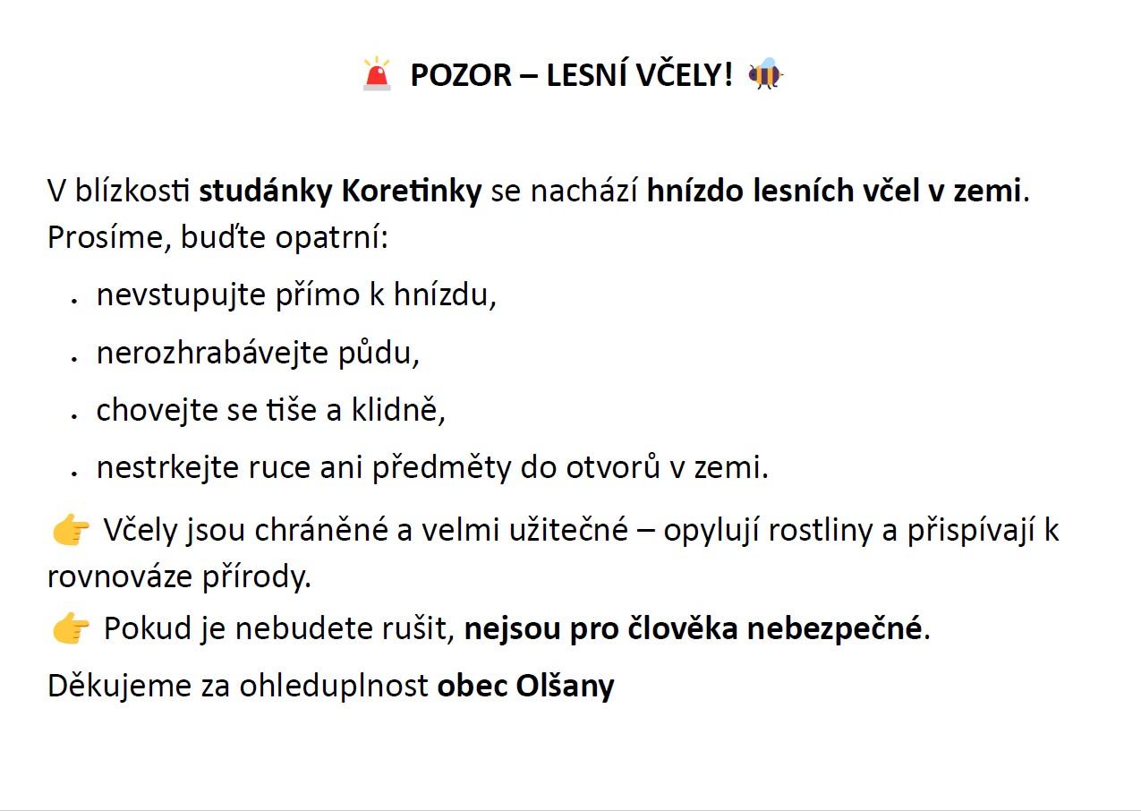 Prosíme o ohleduplnost ke včelám hnízdícím u Koretinky. Dělají pro přírodu i pro nás spoustu užitečného, tak je nerušme při práci.